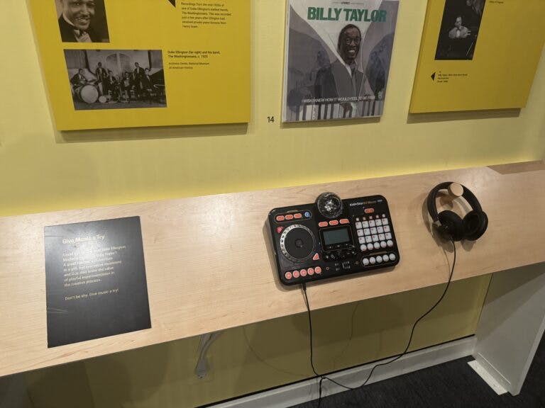 A section dedicated to jazz consists of TVs playing videos, one of which inaccurately claims that the drum was invented in Africa. An exhibit invites visitors to “Give Music a Try” using a DJ machine that allows them to make wicka-wicka record-scratch noises. It wasn’t plugged in.