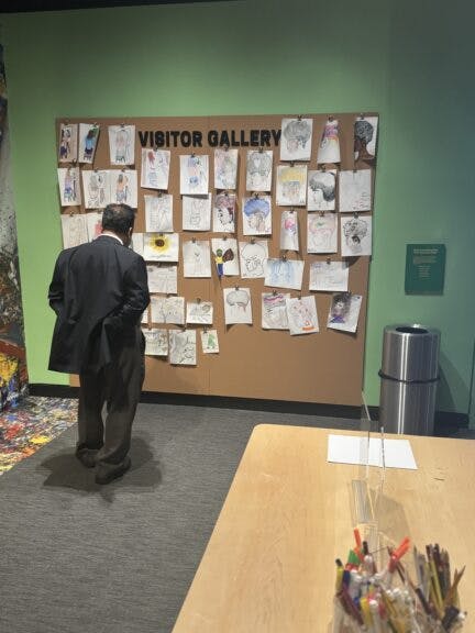 In one of these “Visitor Galleries,” guests take a printed-out piece of paper containing the silhouette of a head with an Afro, color in the hair using provided crayons, and pin it to a large bulletin board. Some added messages on them, such as “Gay Rights Matter.” Another wall is dedicated to pages that visitors colored in using stencils of musical instruments.