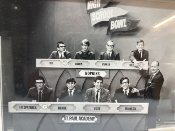 John Fitzpatrick and Jim Vose were the other members of the team. John is the Director Emeritus of the Cornell Lab of Ornithology. Jim is a retired Minneapolis attorney and an accomplished artist. We were all friends. Below is a photo of us in our final appearance on the High School Bowl program. University of Minnesota Professor of Classical and Near Eastern Studies Robert Sonkowsky was the High School Bowl referee. He had to cool things down in case fights broke out. That is Professor Sonkowsky with his hand on my shoulder. I would like to say I was so much older then, but will leave it to Bob Dylan at this point.