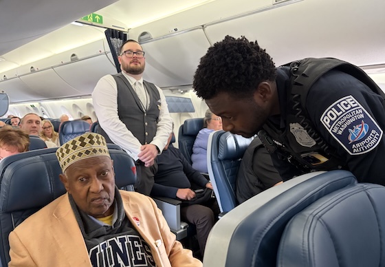 That is a click-bait headline. We hadn’t taken off yet, so we weren’t actually in the sky. And it didn’t turn into a racial incident, although I suspect it was intended to be such.
