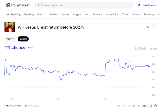 Nowadays, of course, you can bet on virtually anything. The Super Bowl alone offers more than 100 options. You can’t bet on the existence of God, since it would be hard to know who should pay off. But you can bet on the return of Jesus Christ, and people actually do. Currently, the betting odds on Jesus returning during 2026 stand at a little under 4%:
