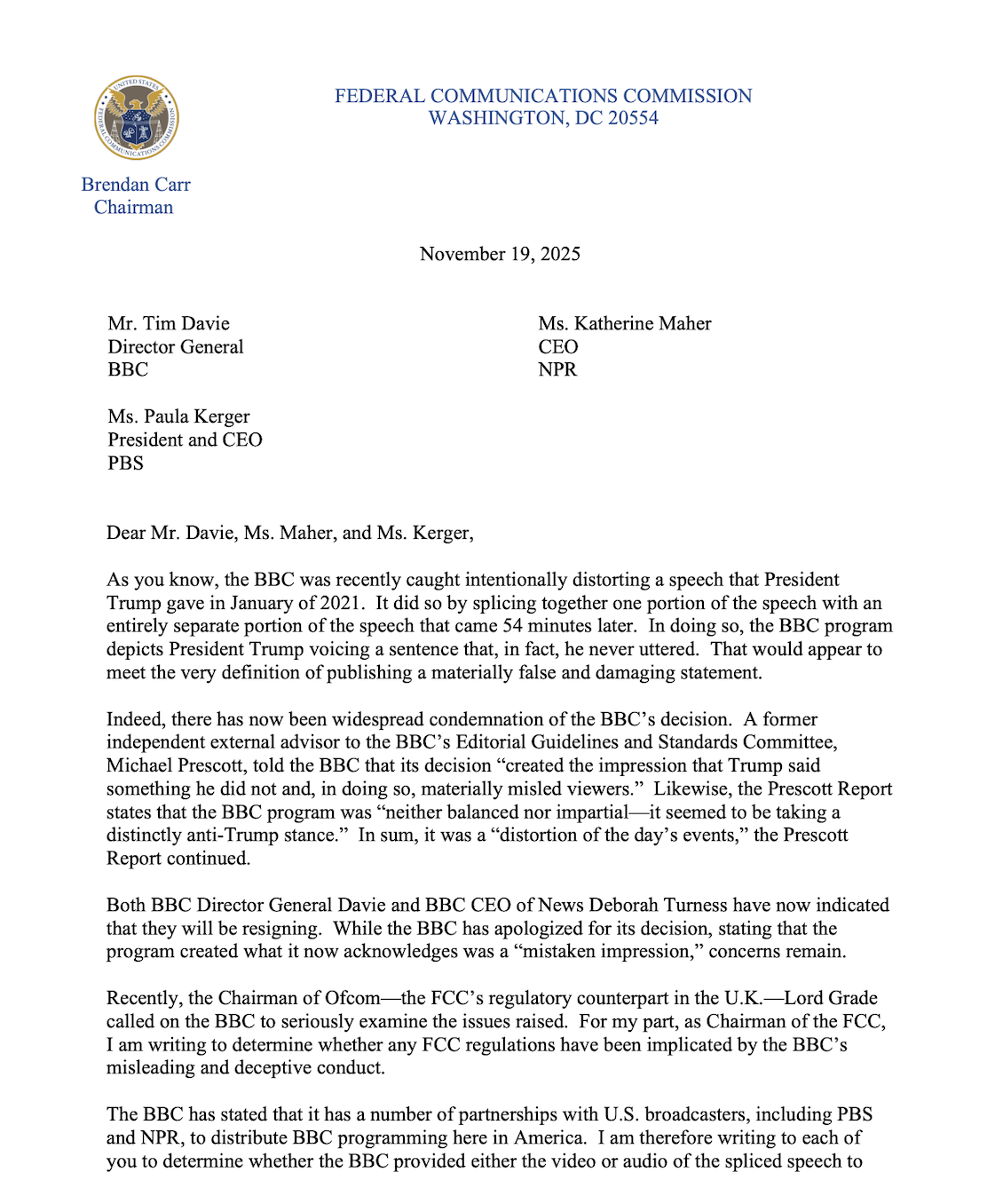 Earlier today, Federal Communications Commission Chairman Brendan Carr fired a shot across the bow of the Public Broadcasting System, National Public Radio and the BBC. In a letter addressed to the leaders of the three organizations, which is reproduced below, Carr recited the fact that the BBC broadcast a false or misleading story on a speech given by President Trump in January 2021: