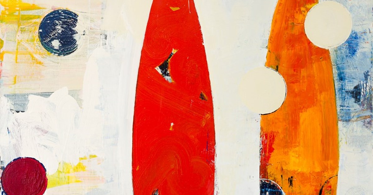 Blacklock has a lexicon of gestural motifs, which he brings into play, one with the other, on the canvas. Ellipses equate to figures, one responding to another to introduce a sense of narrative into the dynamics of the image. In these images, which find their inspiration in alchemy and the work of alchemists and magicians, Blacklock’s circles equate to the fizzing and whirring of ideas in creative space as these set off mini-explosions in the minds of creatives. Where thinned paint drips from these circles, a sense of frustration or weeping is evoked. The colouration of these works also relates to times of day — morning, evening, sunset, night — to add to the sense of time passing and different relationships occurring within times and spaces.