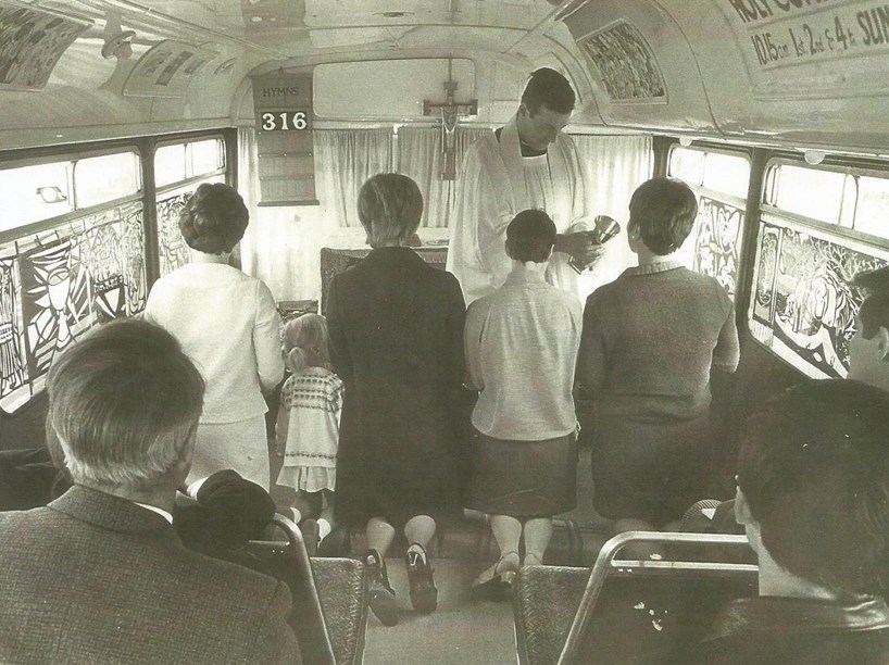 Having procured a bus, the huge task of converting it into a church began. It was given an altar, a cross, and candles, and was fitted with a carpet. Once complete, it was dedicated by the then Bishop of Winchester, the Rt Revd Falkner Allison, on a glorious Sunday in 1966.