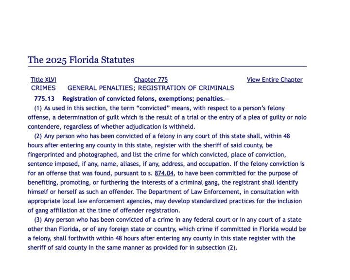By contrast, the law in the state of Florida has a very clear purpose. It’s to keep the people of Florida safe from out-of-state felons. And that law is working perfectly as intended.