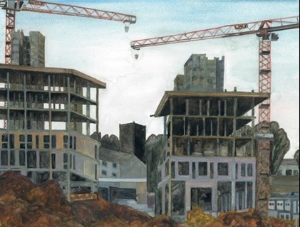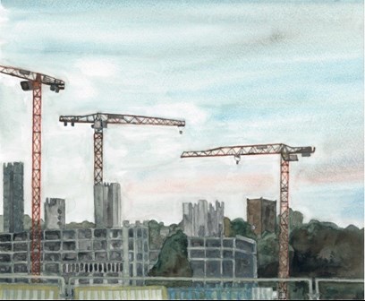 Nevertheless, the images that she has created are of a building site in Sneinton, a suburb of Nottingham where she herself lives. In these images, the small, coal-blackened tower of St Stephen’s, Sneinton, which used to be a focal point of the landscape, is dwarfed by the towering concrete structures of a new development providing student accommodation for Nottingham’s two universities.