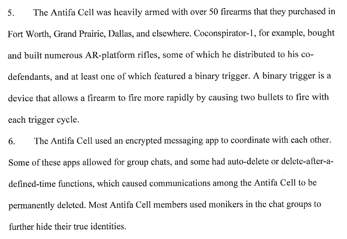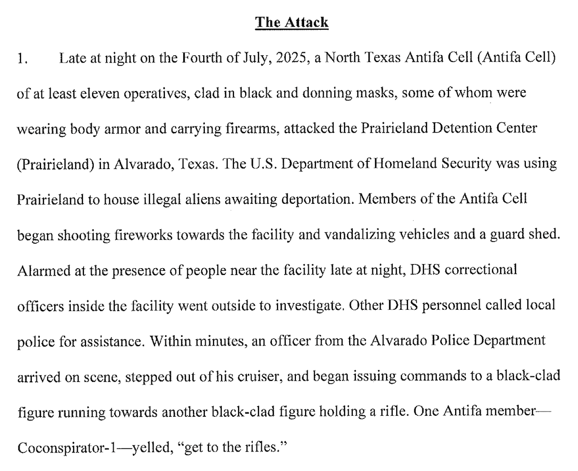 The prosecution arises out of an armed attack on an ICE facility in Texas, in which at least 11 Antifa members participated. You can read the indictment here. These are some of the allegations of the indictment, in which only two of the Antifa members are charged: