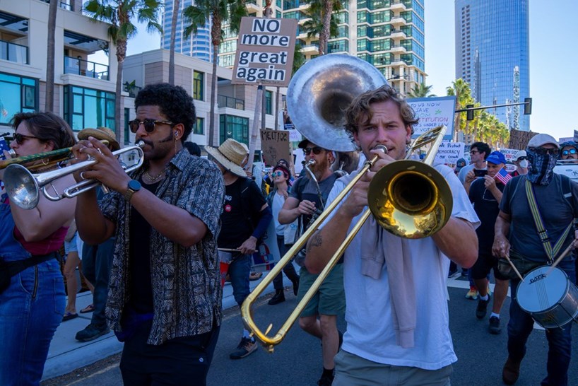 AlamyA brass band marches in the “No Kings” demonstration in San Diego on Saturday