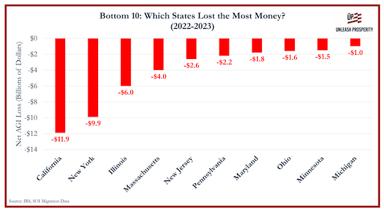 Again, no surprises. High-tax states are collapsing before our eyes, and, of course, it is the states with the most population that lose the most net income.