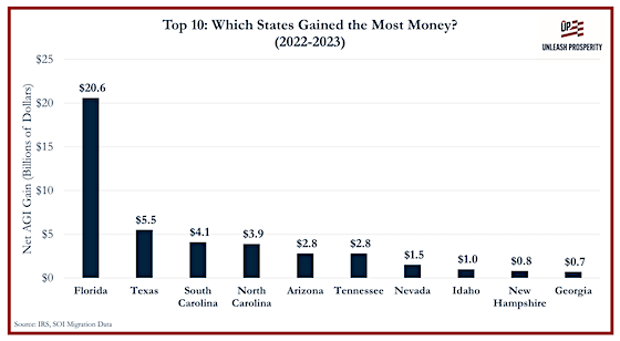 Here are some of the initial findings. These charts show the 10 states that gained and lost the most net income from domestic migration from 2022 to 2023. Red and purple states are gobbling up money from high tax blue states.