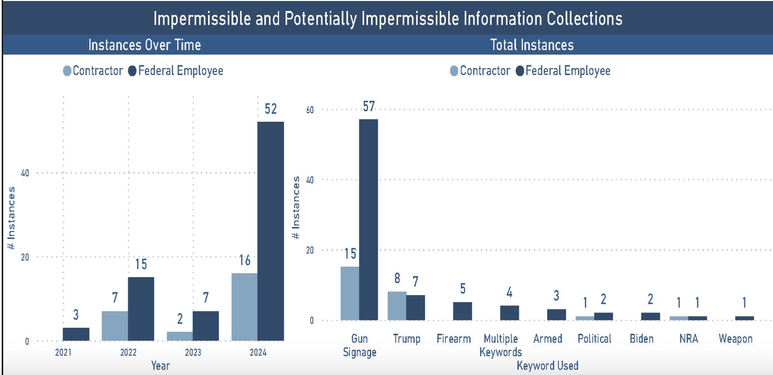 Since September 2021, FEMA employees and contractors flagged things like “gun signage” 72 times, “Trump” 15 times, “firearms” five times, “political” three times, and “Biden” and “NRA” twice, respectively.