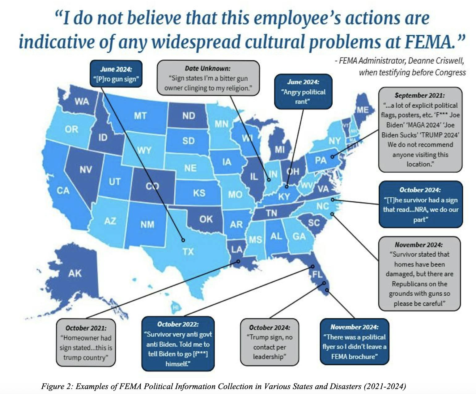 Since Hurricane Ida in September 2021, FEMA employees have made notes about the political beliefs of disaster survivors like “angry political rant,” “Sign states I’m a bitter gun owner clinging to my religion,” “Homeowner had a sign stating… this is trump country,” and “[P]ro gun sign.”