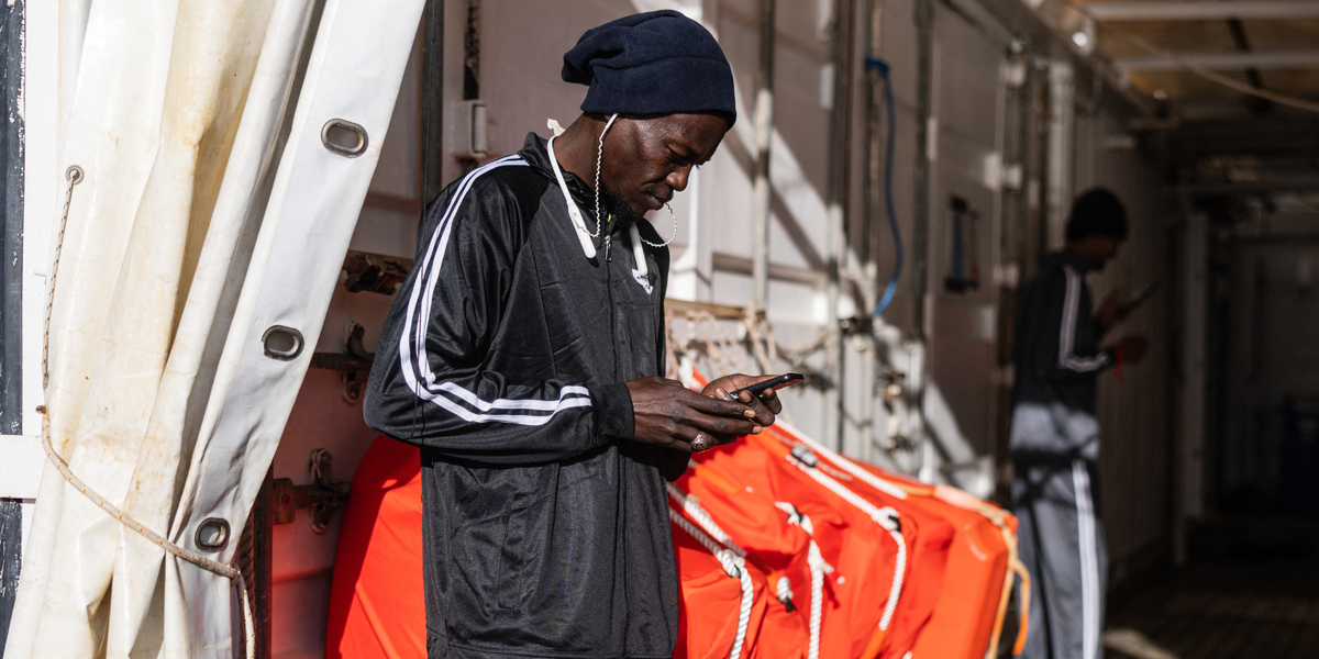 Migrant using phone onboard the rescue ship 'Ocean Viking'