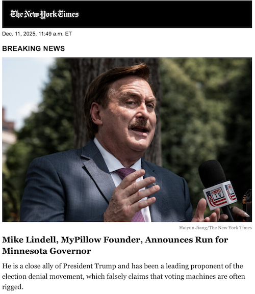 When the Speaker of the Minnesota House filed to run against Walz, was it breaking news? No. When the chairwoman of the Minnesota House anti-fraud committee, who has labored to hold the Walz administration responsible for billions of dollars stolen on its watch, filed to run against Walz, was it breaking news? No. Poor Mike Lindell’s filing was not “breaking news” even for us Minnesota Republicans, but the Times needs to continue feeding its “all elections are completely legit, as long as the Democrat wins” narrative.