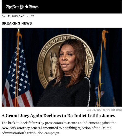 Letitia James was obviously guilty of mortgage fraud, and a grand jury’s refusal to indict, presumably politically motivated–i.e., the grand jurors have been reading the Times–appears to be a troubling instance of (grand) jury nullification. But to the Times, it is all about “the Trump administration’s retribution campaign.” And yet, when the Democrats disgracefully tried to imprison Trump on the most ridiculous charges imaginable, did the Times write about the Biden administration’s retribution campaign? No.