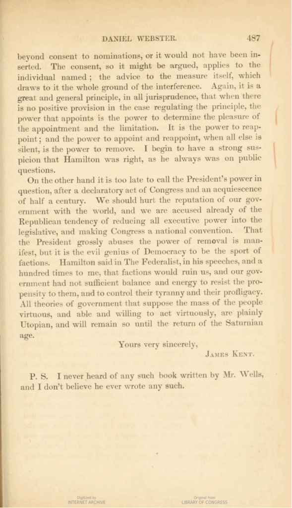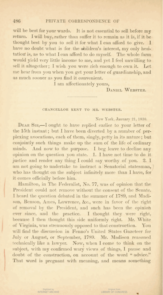 In [Senator Daniel] Webster[‘]s Private Correspondence, vol.1, pp.486-7, there is a letter from Chancellor Kent upon the subject. After remarking that at the time of the debate in 1789, he had leant toward Madison, but now (1830) because of the word “advice” must have meant more than consent to nomination, he said he had a strong suspicion that Hamilton was right in his remark in the Federalist, no.77, April 4th, 1788: “No one could fail to perceive the entire safety of the power of removal if it must thus be exercised in conjunction with the senate.” [italics added] [bold and italics added]