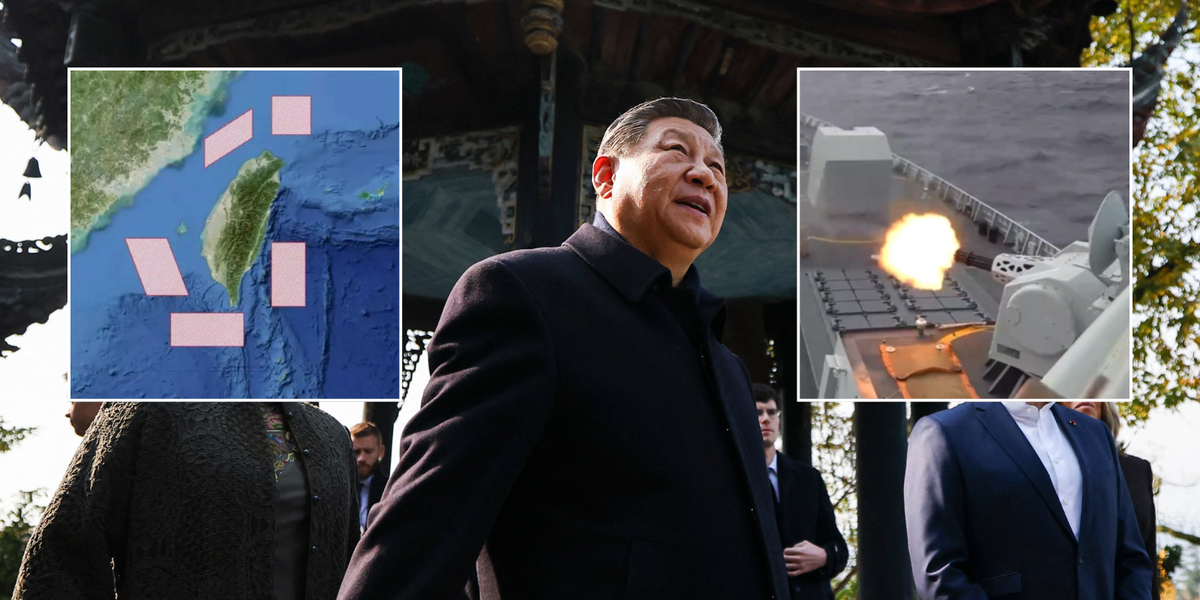 PICTURED: Xi Jinping and Emmanuel Macron in China. President Xi’s forces surrounded Taiwan in a major live-fire drill this morning