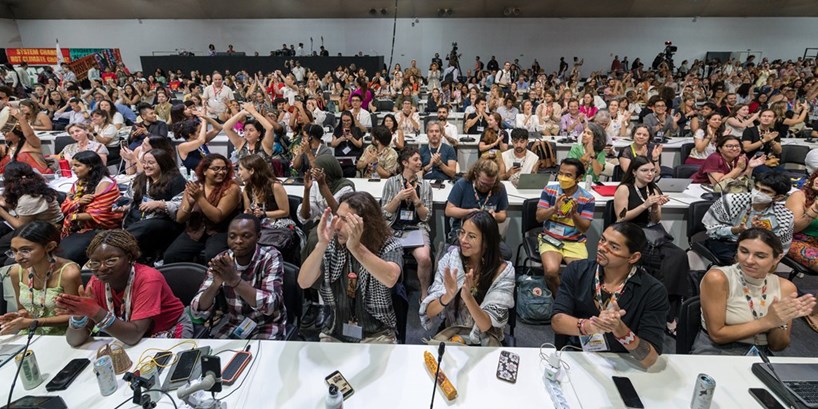 ALBIN HILLERTCivil society representatives applaud at a People’s plenary held on Friday, the final day of COP30