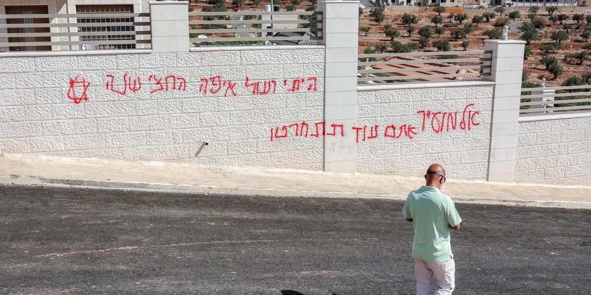 A man walks past Hebrew graffiti reading “Al-Mughayyir, you will regret” reportedly painted by Israeli settlers on a Palestinian home following an overnight attack on the Palestinian Christian village of Taybeh