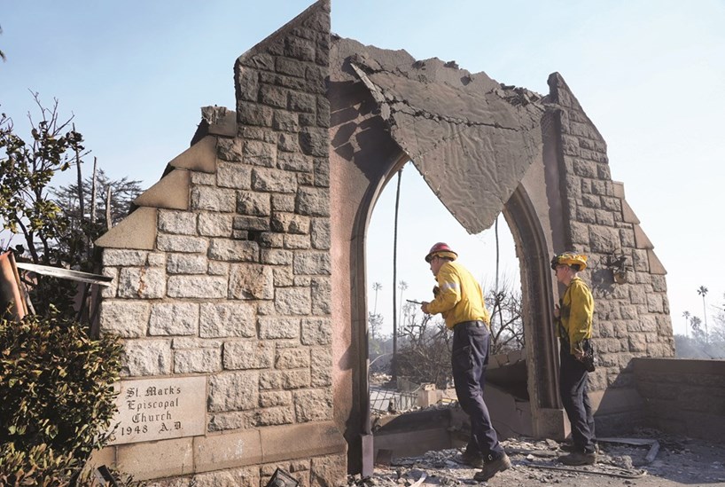 AlamyFirefighters study damage at St Mark’s, Altadena, California, after it was destroyed by the Eaton fire, in January