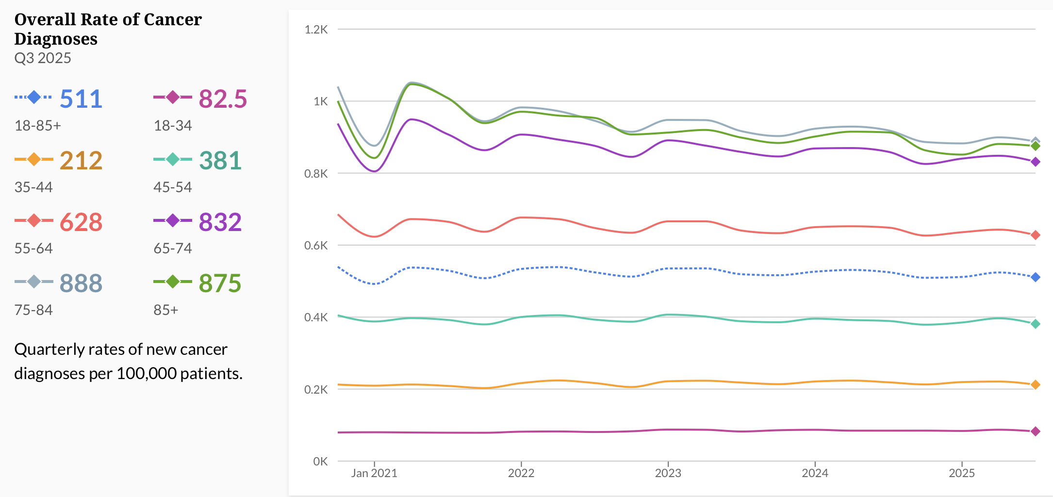 Before analyzing those studies, let’s just consider what’s happening in the United States. Since 2021, around 82 percent of Americans have received at least one COVID-19 shot (mostly mRNA vaccines). Is there any evidence for an “exponential” turbo-cancer epidemic in the United States? Not at all. In fact, since the vaccine rollout, the electronic health records analysis firm Epic Research reports new cancer diagnoses in the U.S. are flat or slightly declining for most age groups.
