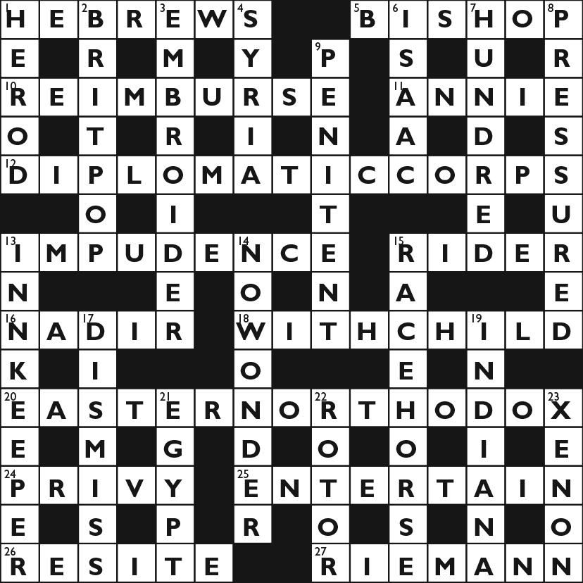17 A whole congregation eg, including a cricket side, upset dean completely (3,3,3)