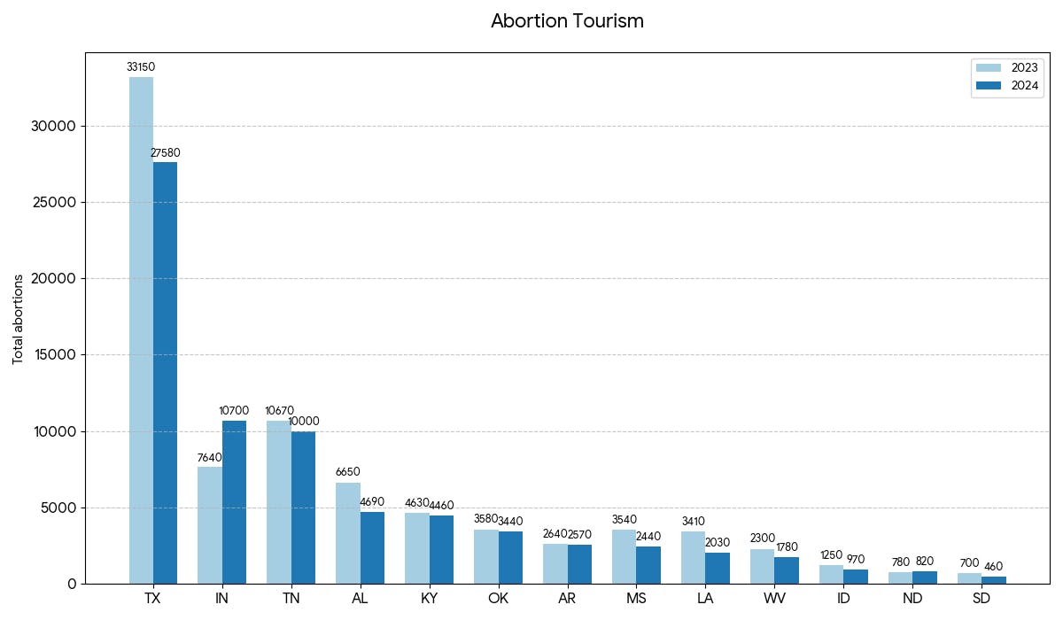 Aside from the problem of mail-order abortions, pro-lifers will also have to grapple with the increasing number of travel abortions. Tens of thousands of women have traveled out of their home state for abortions over the last few years. According to the data, women traveling out of states for abortions declined for the most part across the thirteen states with the strongest pro-life laws from 2023 to 2024, but the number was still significant.