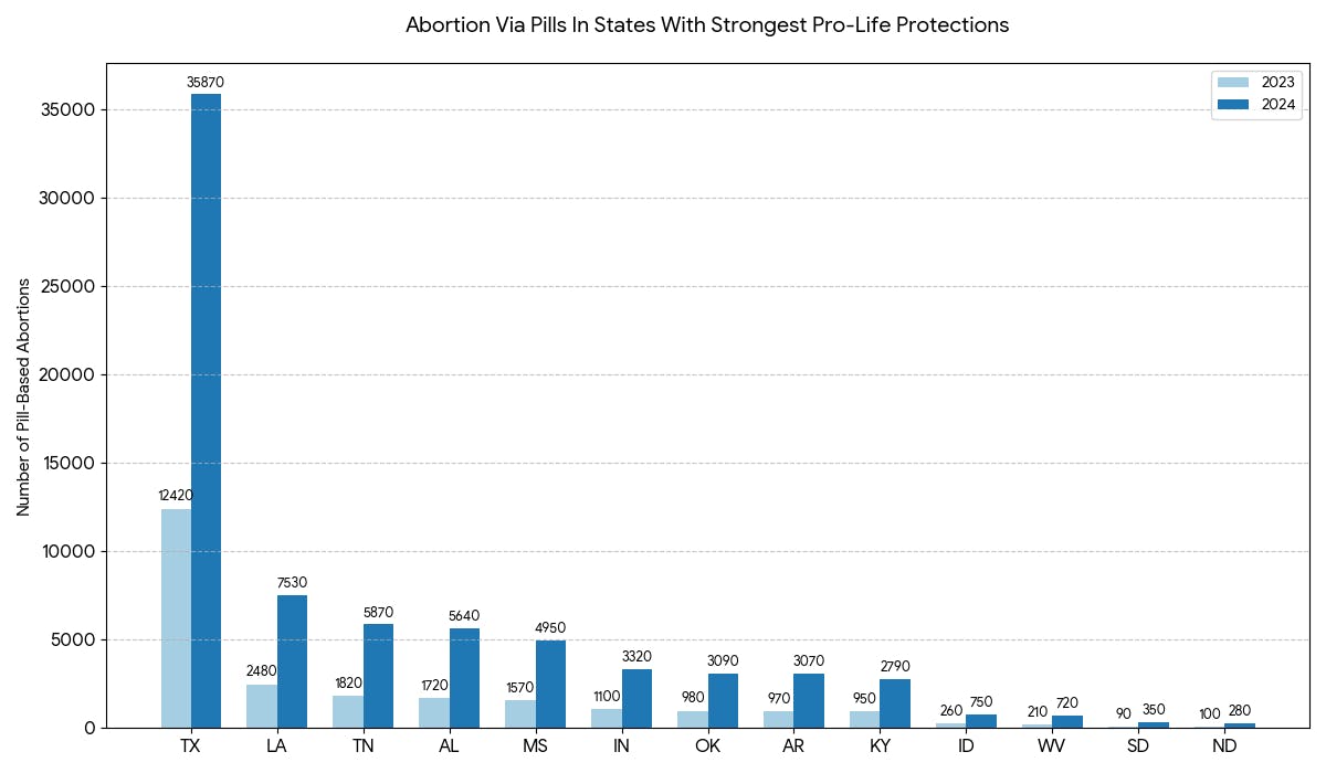 In Louisiana, for example, there were 7,530 pill abortions in 2024 compared to 2,480 in 2023. In Texas, there were an estimated 35,870 abortions by pill in 2024 compared to 12,420 in 2023. These abortions took place despite both states having laws in place banning medication abortions.