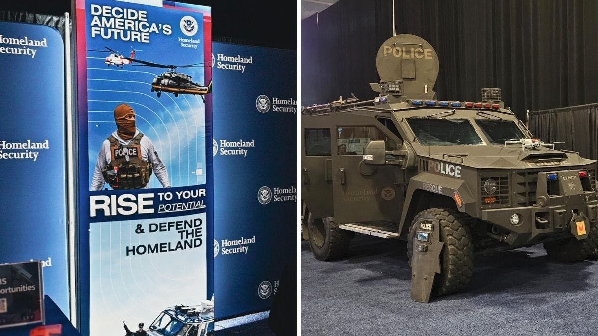 With an influx of $165 billion from Trump’s One Big Beautiful Bill, DHS has focused on hiring more officers and agents to ramp up arrests and deportations. DHS arrived at the conference with a BearCat armored vehicle and signage reading “Decide America’s future, rise to your potential & defend the homeland.”