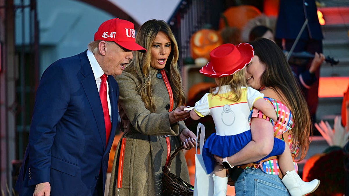 In one notable moment, the president placed a candy bar on the flat head of a trick-or-treater dressed as a marshmallow, replicating a viral moment from years ago when he and Melania Trump both placed candy bars on top of a young Minion trick-or-treater.