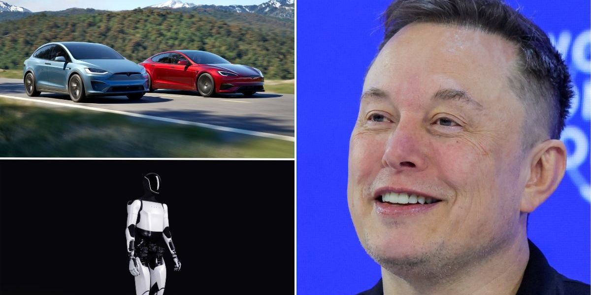 Tesla Model S, Tesla Model X, Elon Musk and a Tesla Optimus humanoid robot