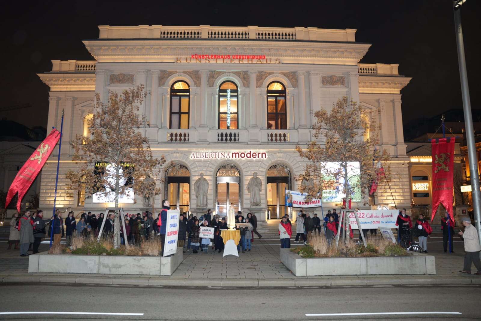 (LifeSiteNews) — Catholics held a Rosary rally on Monday in front of a blasphemous art exhibit in Vienna as a public act of reparation for the offense against God.