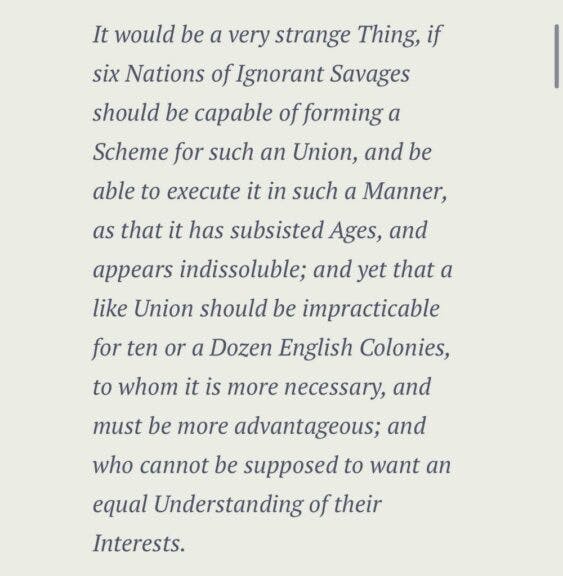 So Franklin isn’t talking about war with Britain, or establishing an independent nation, or anything like that. Remember, this is decades before the American Revolution. And Franklin certainly isn’t praising any “thriving democracy” in the Iroquois Confederacy, because there isn’t one. Instead, he’s talking about a straightforward plan to unite the colonies so that they function more like a political unit, rather than 13 completely separate entities. And he’s saying, “If these savages can form a confederacy to function as a unit, then obviously we can do it, too.”