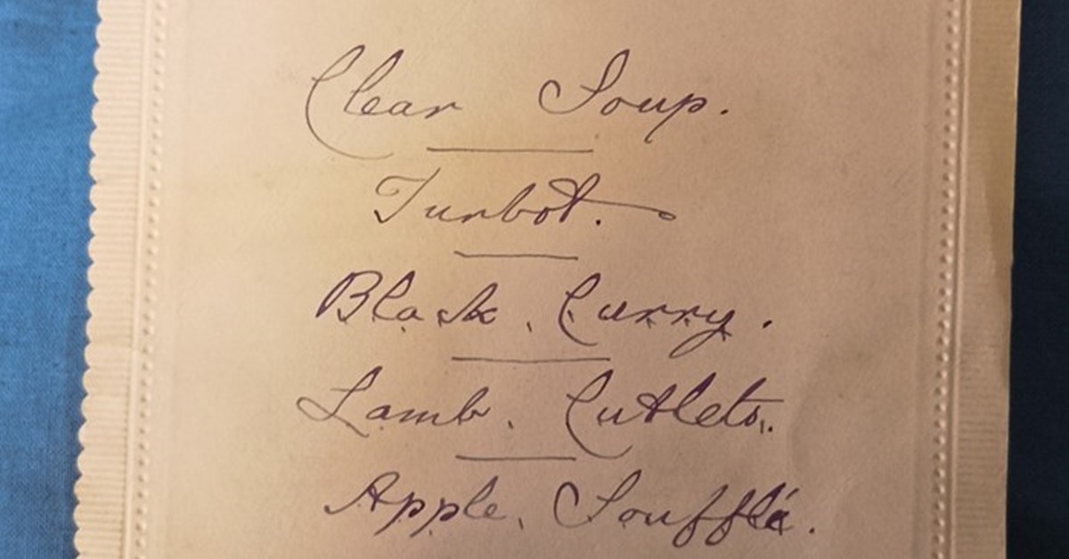 The letter contains a menu and a seating plan, which, the Lincoln archivists speculate, may have been sent with the letter or brought back as a memento. On the menu were clear soup, turbot, black curry, lamb cutlets, apple soufflé, and apricot cream.