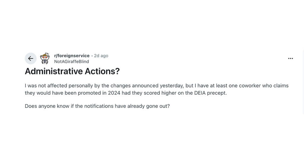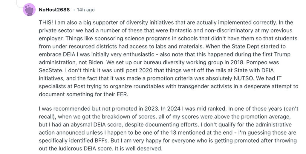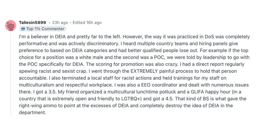“I’m a believer in DEIA and pretty far to the left,” one person who claimed to be a foreign service member wrote on Reddit. “However, the way it was practiced in DoS was completely performative and was actively discriminatory.”