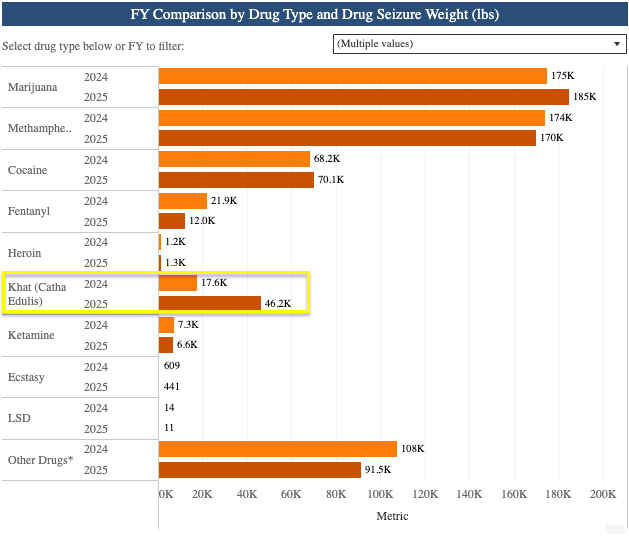 While Customs and Border Protection saw a year-over-year decline in the seizure of many drugs in fiscal year 2025, the amount of khat seized more than doubled.
