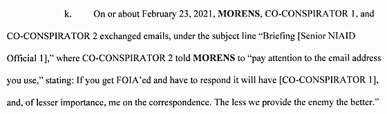 That is the subject matter of a large number of emails that circulated among David Morens and his alleged co-conspirators, beginning in 2020. Morens sought to prevent their communications from coming to light by deleting them from his official government account, and instead using a private gmail account. (It is illegal to transact government business on private email accounts, but it appears to be common practice in Democratic administrations.) The purpose is to prevent communications from being made public as a result of a FOIA request. Thus, from the indictment: