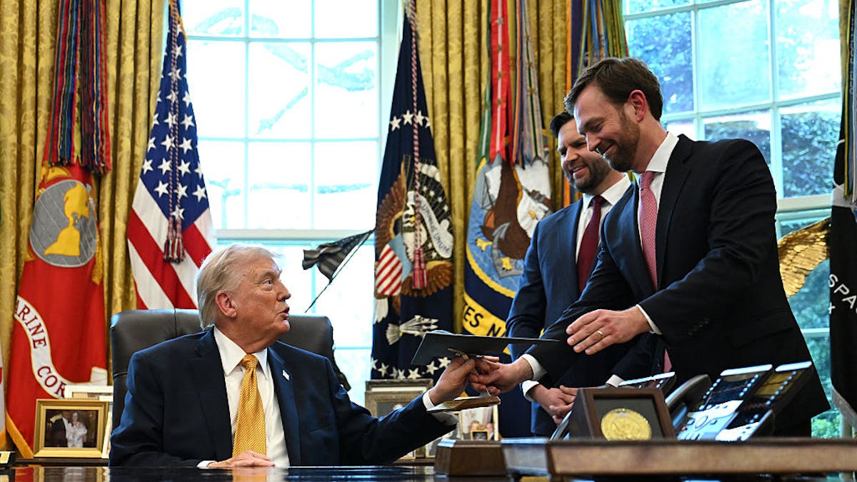 U.S. President Donald Trump and Vice President JD Vance listen as Federal Trade Commission Chairman Andrew Ferguson speaks in the Oval Office of the White House on March 16, 2026 in Washington, DC.  (Photo by Alex Wong/Getty Images)