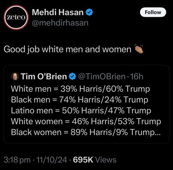 “Good job, white men and women,” Hasan wrote, blaming them for Kamala Harris’ defeat.