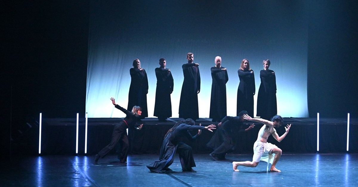 With a dawn-pink light projected on to a back screen, six black-cassocked singers and four dancers moved forward en masse slowly and gravely on to a stage bare except for a raised platform. The singers, directed by the tenor Paul Agnew, had Gesualdo’s strange, chromatic harmonies by heart, leaving them free to participate in the action. Damiano Bigi’s white-clad Christ prays to his Father on the Mount of Olives, and the singers intone “Fiat voluntas” (Thy will be done) and hiss “Amicus meus osculi me tradidit signo” (My friend betrayed me with a kiss), with surtitle translations. The line from Lamentations “Ierusalem, convertere ad Dominum” (Jerusalem, return to your Lord) runs as a thread throughout, perhaps drawing our attention to the current state of the world.
