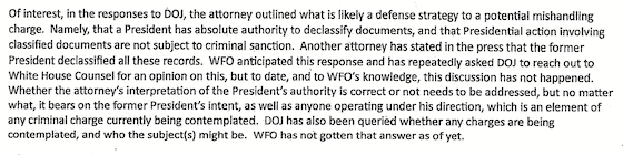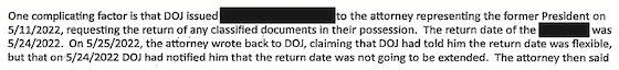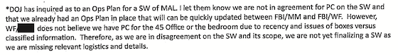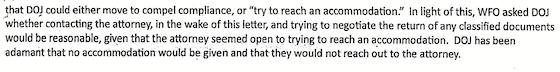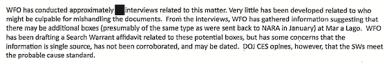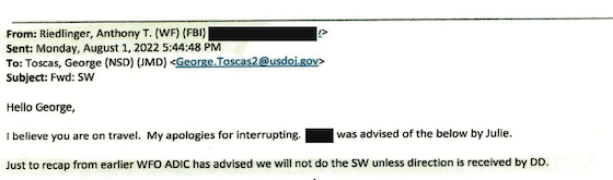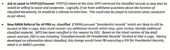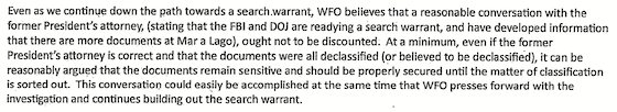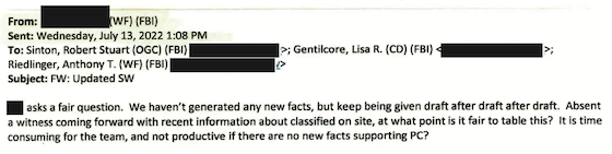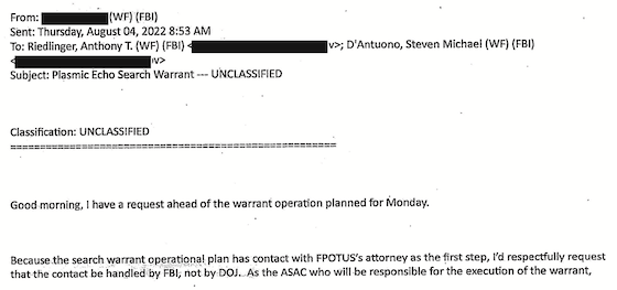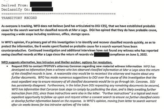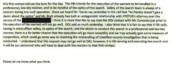 Comments you may have seen on the emails are correct: the FBI didn’t think there was probable cause to search Trump’s home, but Merrick Garland’s Department of Justice insisted. The FBI thought they should communicate with Trump’s lawyer and likely be able to reach an agreement. Garland’s DOJ refused. The FBI pointed out that President Trump likely had a good legal argument on the documents; DOJ didn’t care.