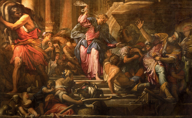 At that time: When he was come into Jerusalem, the whole city was moved, saying: Who is this? And the people said: This is Jesus the prophet, from Nazareth of Galilee. And Jesus went into the temple of God, and cast out all them that sold and bought in the temple, and overthrew the tables of the money-changers, and the chairs of them that sold doves. And he saith to them: It is written, ‘My house shall be called the house of prayer; but you have made it a den of thieves.’ And there came to him the blind and the lame in the temple: and he healed them. And the chief priests and scribes seeing the wonderful things that he did, and the children crying in the temple, and saying: ‘Hosanna to the son of David,’ were moved with indignation, and said to him: Hearest thou what these say? And Jesus said to them: Yea, have you never read, ‘Out of the mouths of infants and of sucklings thou hast perfected praise?’ And leaving them, he went out of the city into Bethania, and remained there.