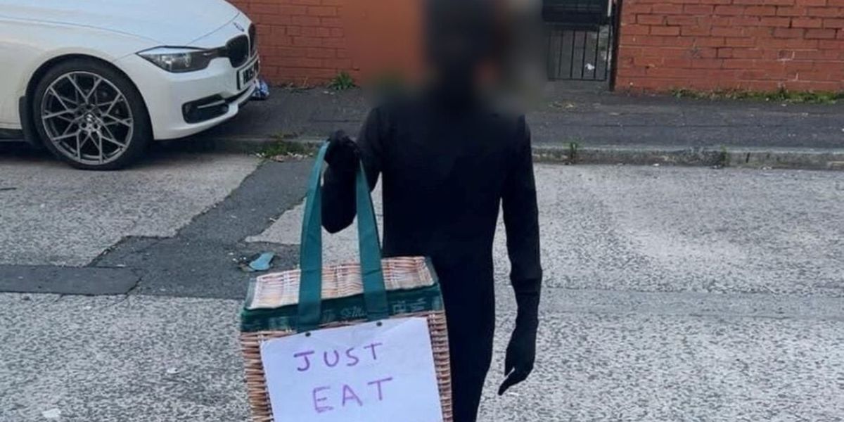 A racism row has erupted after a British schoolboy dressed up as a Just Eat delivery driver in a full black bodysuit.