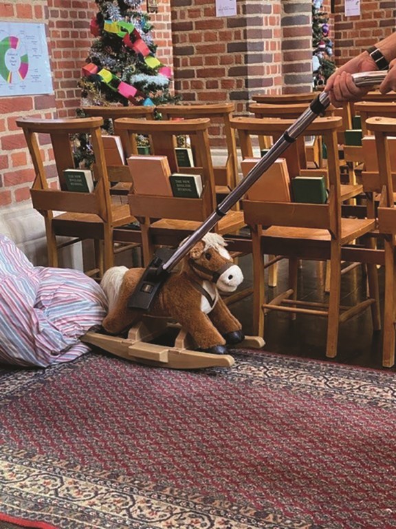 “When I said I was feeling a little hoarse from all the dust . . . I definitely didn’t mean for this to happen!” (Kristyn Harris); “The church cleaners found a new way to brush up the Vicar’s favourite pony” (Paul MacDermott); “All God’s creatures welcome. Some may require deep cleaning” (Gavin Cowell); “Nature adores a vacuum” (Martin Kettle); “The live pets were queueing up to get their backs scratched, too” (Valerie Budd); “The prop for the Skin Horse story re-enactment needed some serious distressing” (Paulette Yallop); “When the horse sheds too much, so you take matters into your own hands” (Michelle James); “Dust to dust, and pony to pony” (Rachel Greening); “The rocking horse, spruced up and looking in its prime, and the beanbag ready for children at the midnight Christmas mass” (Dev Nallathamby); “Nothing escapes our custodian’s spring cleaning” (Chaz Griffiths).