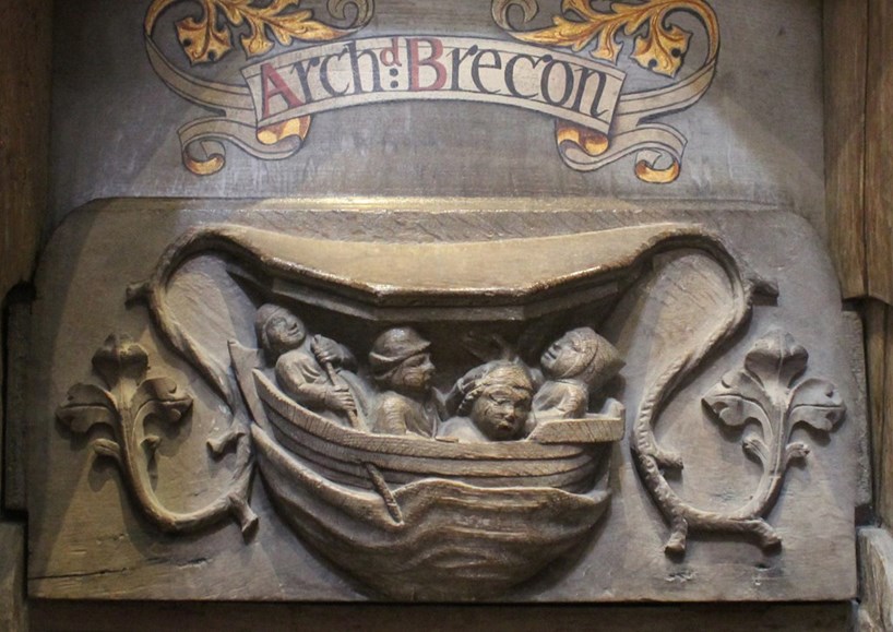 A seasick pilgrim, from a late medieval misericord at St Davids Cathedral