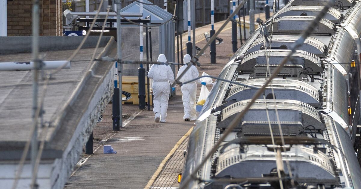 Police have remained on the scene at Huntingdon railway station all day, with forensic teams pictured inside the train.