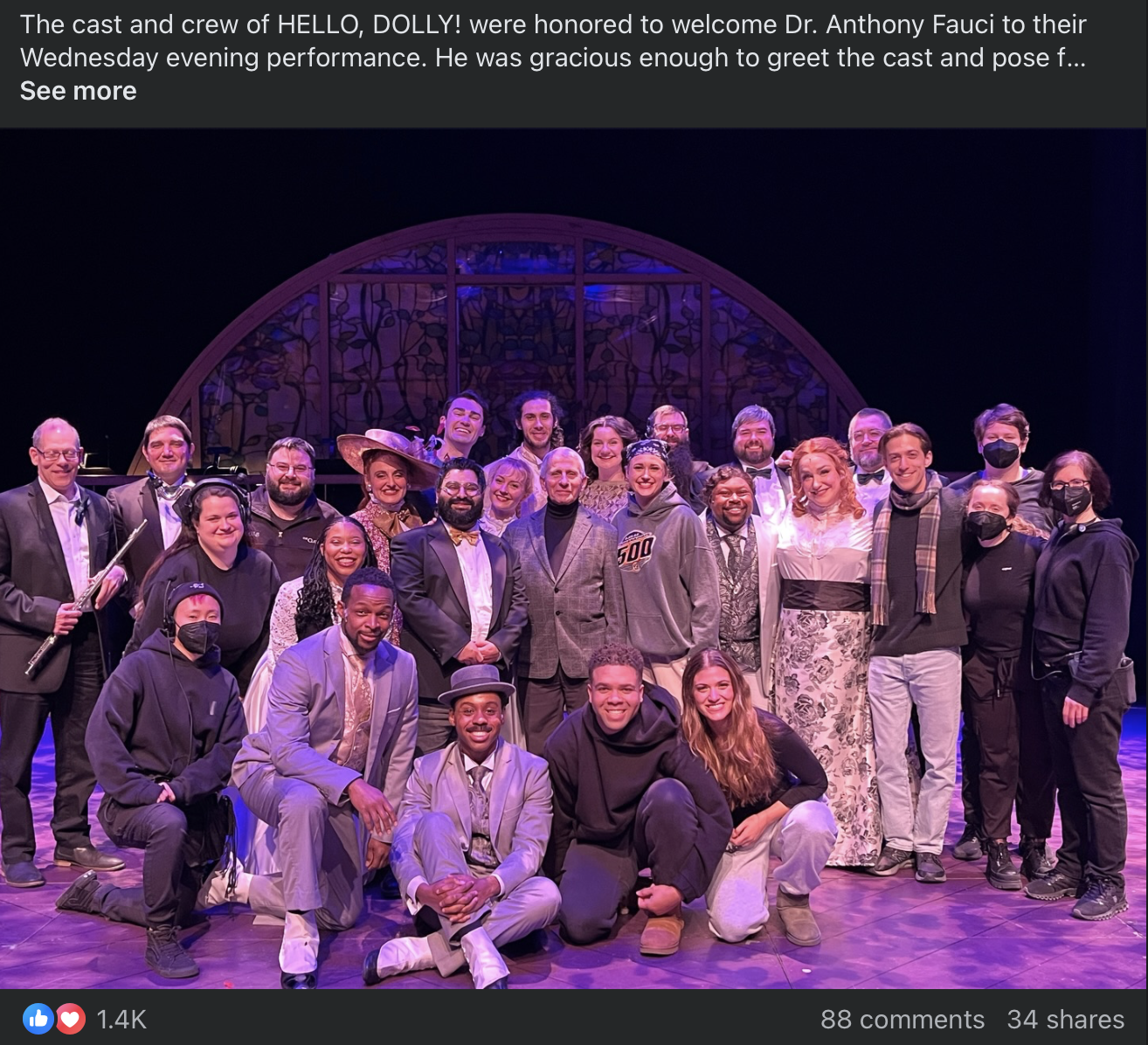 In an incredibly ironic, un-self-aware move, the theater posted a photo on social media of Fauci posing with the “Hello, Dolly!” cast and musicians, proclaiming they were honored to welcome him to the performance, despite the fact that he is ultimately responsible for shutting down their theater and the theater industry across the country for two years.