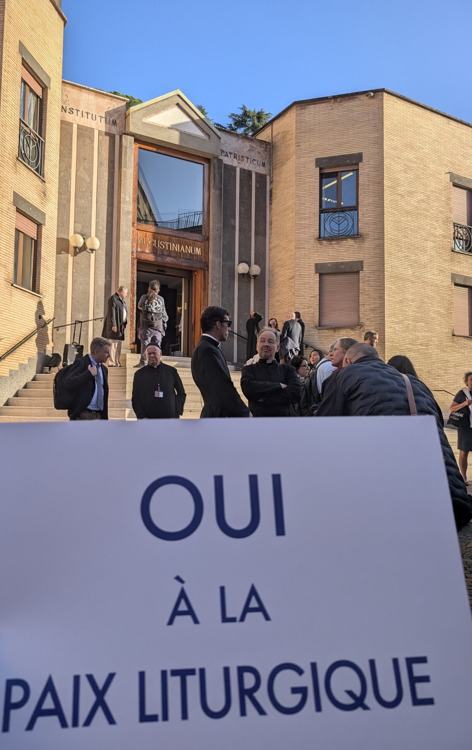 At the entrance of the Augustinianum pilgrims received placards that read “Oui à la paix liturgique!” – Yes to liturgical peace! The event itself was co-organized by the group Paix Liturgique, whose name strongly resembled the posture of the pilgrims.