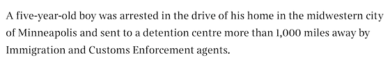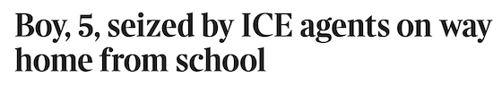 The latest instance is the tale of the five year old boy who was “arrested” by ICE. This story has not just gone national, it has become international news. Thus, the front page of the London Times carried this headline: