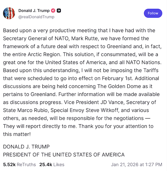 Of course not. I doubt whether an order to our armed forces to invade Greenland would have been obeyed, and certainly an order to attack Canada would not have been obeyed. But Trump’s other announcements, on Truth Social, were more substantial: